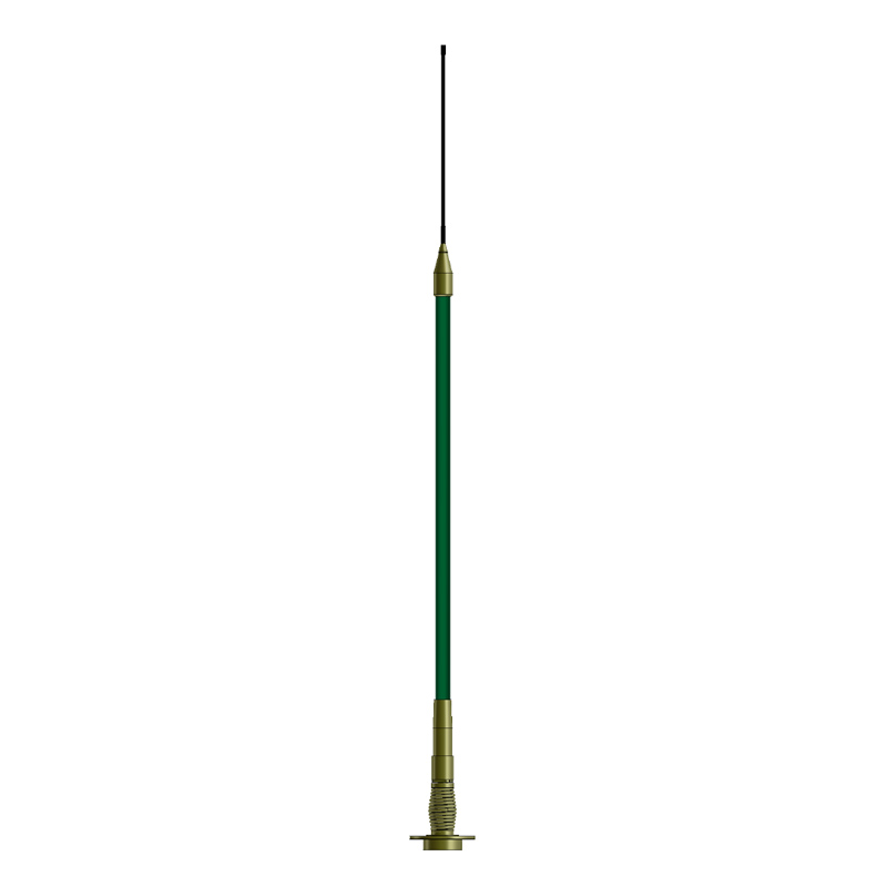 The 020107 is a broadband, reduced-height EW antenna covering 25–520 MHz. Designed for heavy-duty use, it is removable from its rugged military spring mounting and features a flexible 6.35 mm stainless steel top section. While essentially ground-independent, the antenna benefits from a vehicle ground plane at lower frequencies to achieve maximum performance.